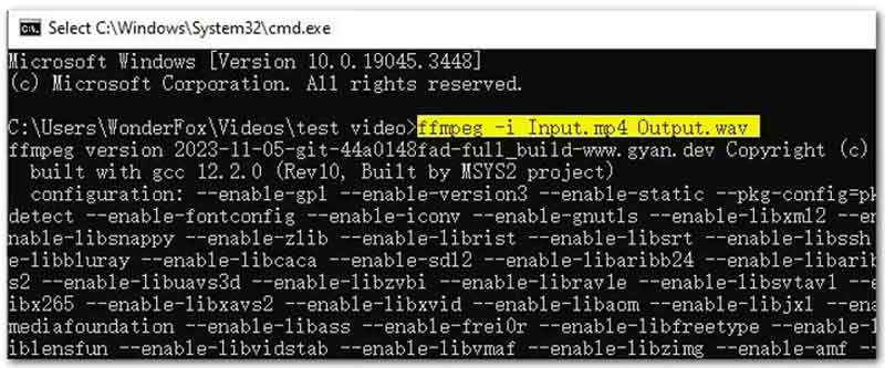 Step 2. Find your WAV audio file and replace the file path with CMD to start the FFmpeg command window.