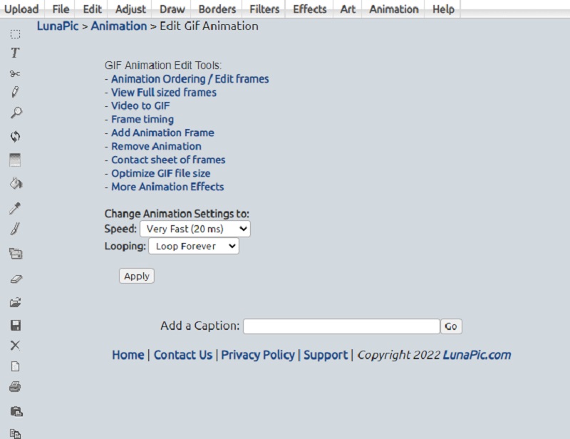 Lunapic is yet another online program that may modify the speed of a GIF file and is referred to as a GIF speed editor. In addition to being able to speed up or slow down the tempo of a GIF, it can also change individual frames, create transitions, and perform various other operations. Select the pre-defined speed choice and the looping function once the file has been uploaded. You can deactivate this function, which is a great helpful thing if you do not want the GIF you created to loop.
