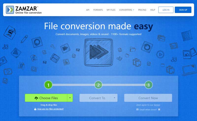 Zamzar è uno dei convertitori video online più popolari. Supporta la maggior parte dei formati video sul mercato e puoi convertirli liberamente da uno all'altro, come da WMV a MP4. Permette anche di convertire più file video alla volta.