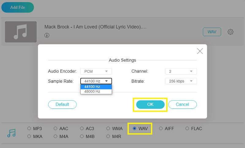 Langkah 2. Import fail MP3 dengan mengklik butang yang sama. Pada panel penukaran, tandakan pada format fail WAV. Di bawah Tetapan Audio, anda juga boleh mengubah kadar bit, kadar sampel, dan saluran. Klik okey butang untuk menyimpan perubahan.