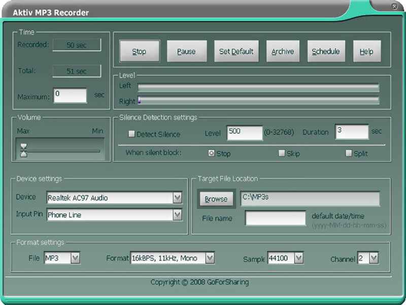 Aktiv MP3 Recorder enables you to choose the volume level and set a maximum recording time in secosnds. It is also designed with a recording schedule feature for you to automatically record various audio contents to listen to later. This free MP3 recorder only supports Windows system.